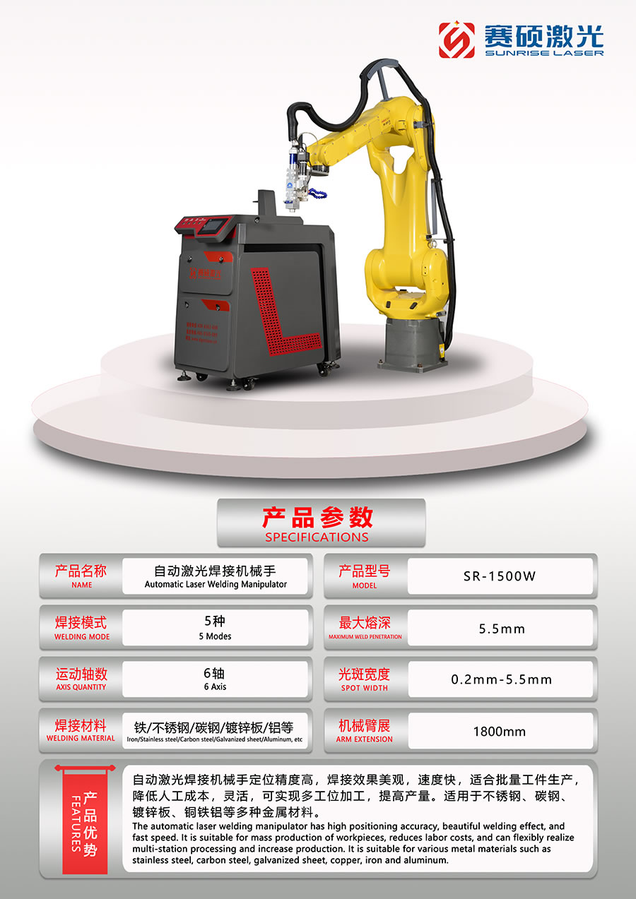 自動激光焊接機(jī)械手定位精度高,焊接效果美觀,速度快,適合批量工件生產(chǎn),降低人工成本,靈活,可實(shí)現(xiàn)多工位加工,提高產(chǎn)量。適用于不銹鋼、碳鋼、鍍鋅板、銅鐵鋁等多種金屬材料。