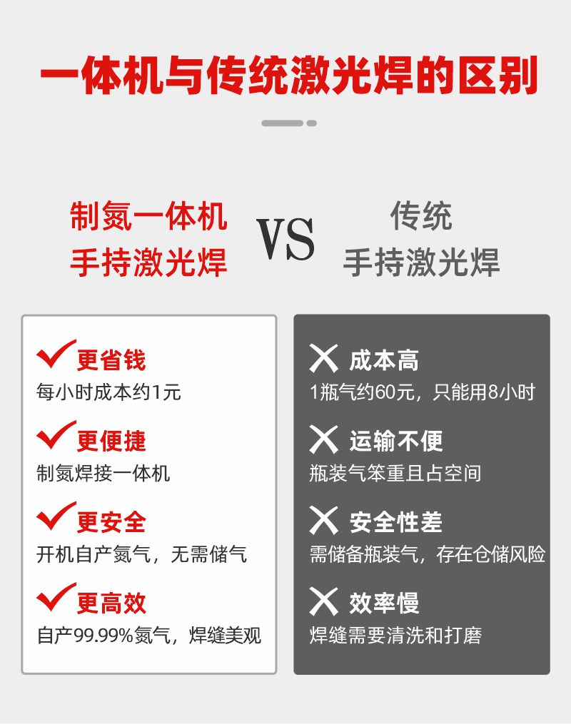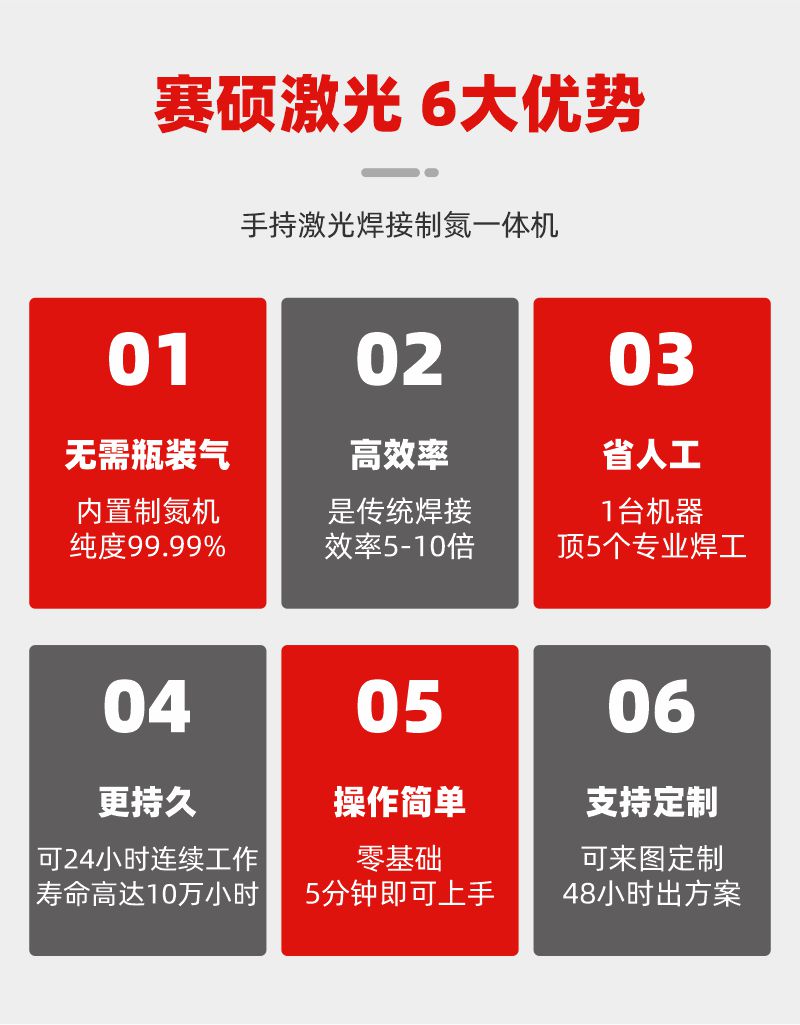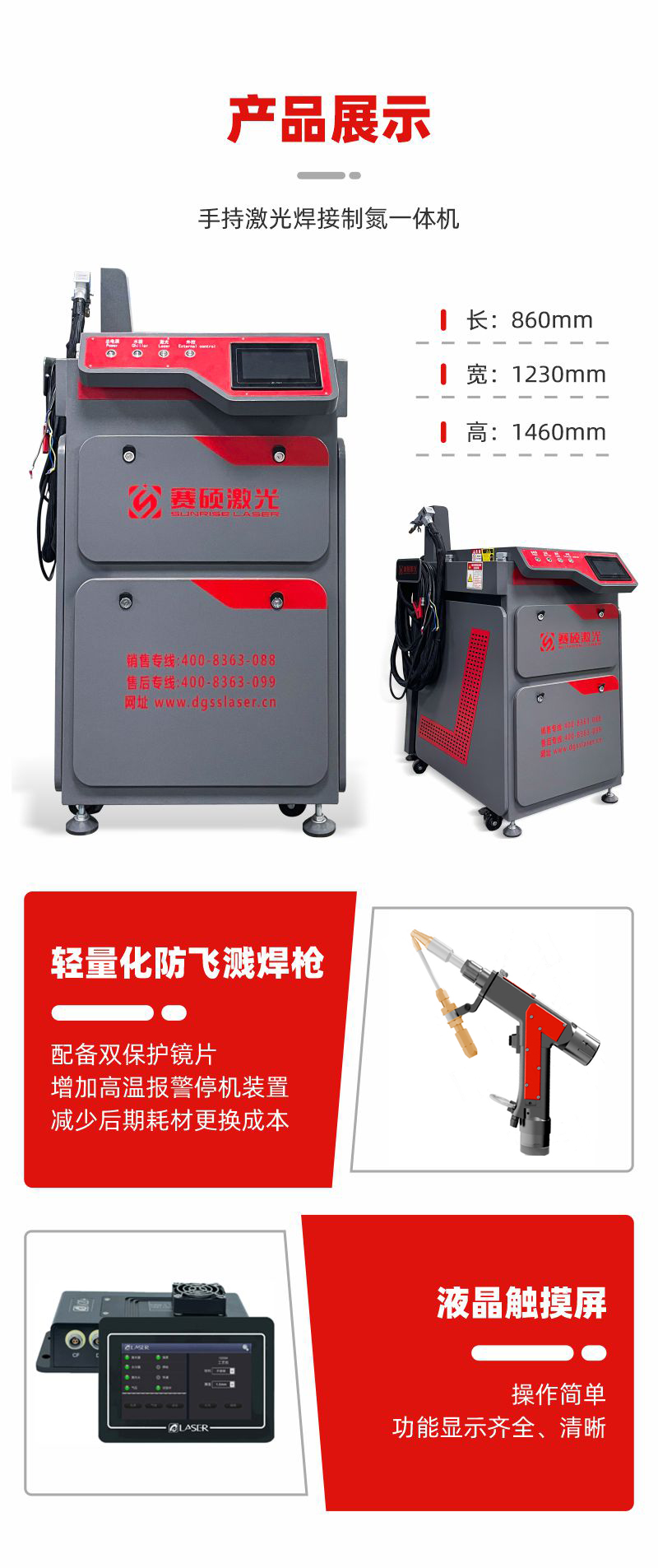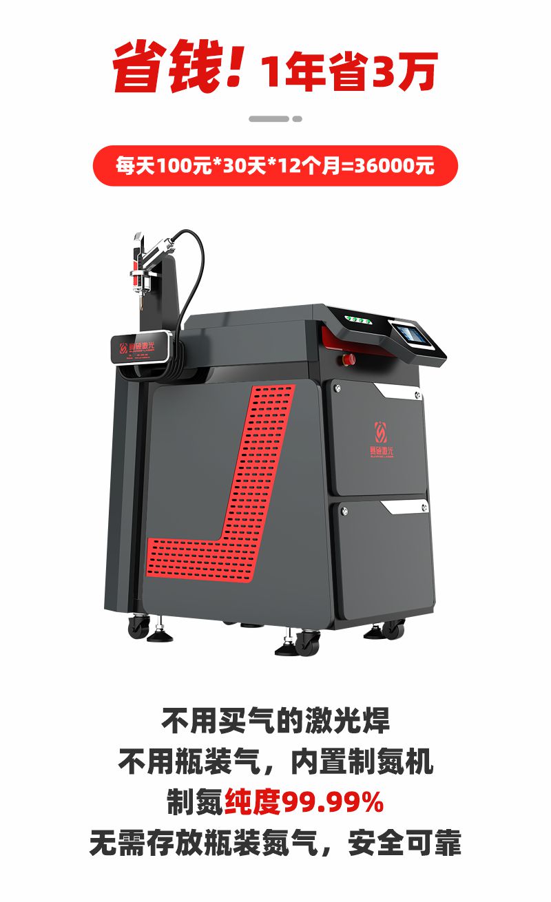 賽碩BG-N系列手持式激光焊接制氮一體機(jī),內(nèi)置制氮機(jī),可自產(chǎn)高純度氮?dú)?,純度高達(dá)99.99%,每年可節(jié)省3萬(wàn)氮?dú)赓M(fèi)用。其操作簡(jiǎn)便,僅需5分鐘就能輕松上手。焊接時(shí),無(wú)黑煙、無(wú)飛濺、無(wú)焊渣,一拉即可成型。焊縫亮白平整,大大減少拋光打磨的工序。具有成本低、效率高、安全便捷的顯著特點(diǎn)??蓮V泛應(yīng)用于不銹鋼、碳鋼、鐵、鋁、鍍鋅板等多種金屬材料的焊接。